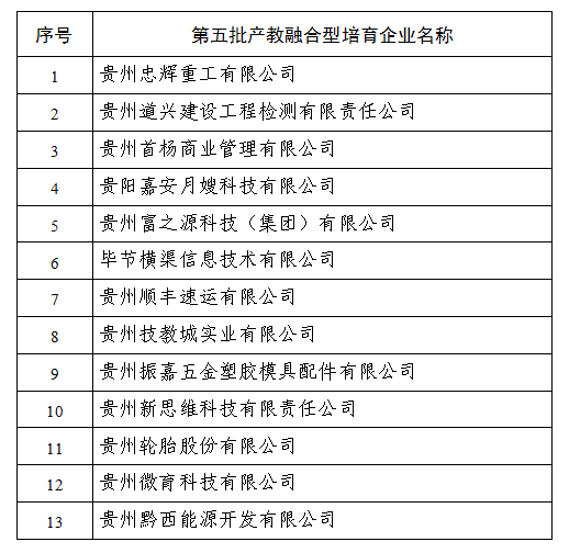 根据《省发展改革委等六部门关于印发贵州省建设培育产教融合型企业工作方案的通知》《贵州省产教融合建设试点实施方案》要求,经企业自愿申报、部门审核、专家评估,拟确定13家企业为贵州省第五批产教融合型培育企业,现予公示。