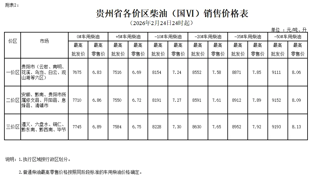 2.贵州省各价区柴油(国VI)销售价格表