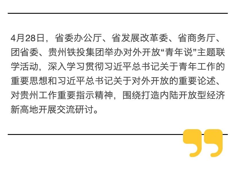 开放潮涌,青春扬帆。在五四运动105周年来临之际,4月28日,省委办公厅、省发展改革委、省商务厅、团省委、贵州铁投集团举办对外开放“青年说”主题联学活动,深入学习贯彻习近平总书记关于青年工作的重要思想和习近平总书记关于对外开放的重要论述、对贵州工作重要指示精神,围绕打造内陆开放型经济新高地开展交流研讨。贵州铁投集团党委副书记刘卫东出席并讲话,省发展改革委机关党委专职副书记卢启伦主持会议,5家单位120余名青年干部职工参加活动。
