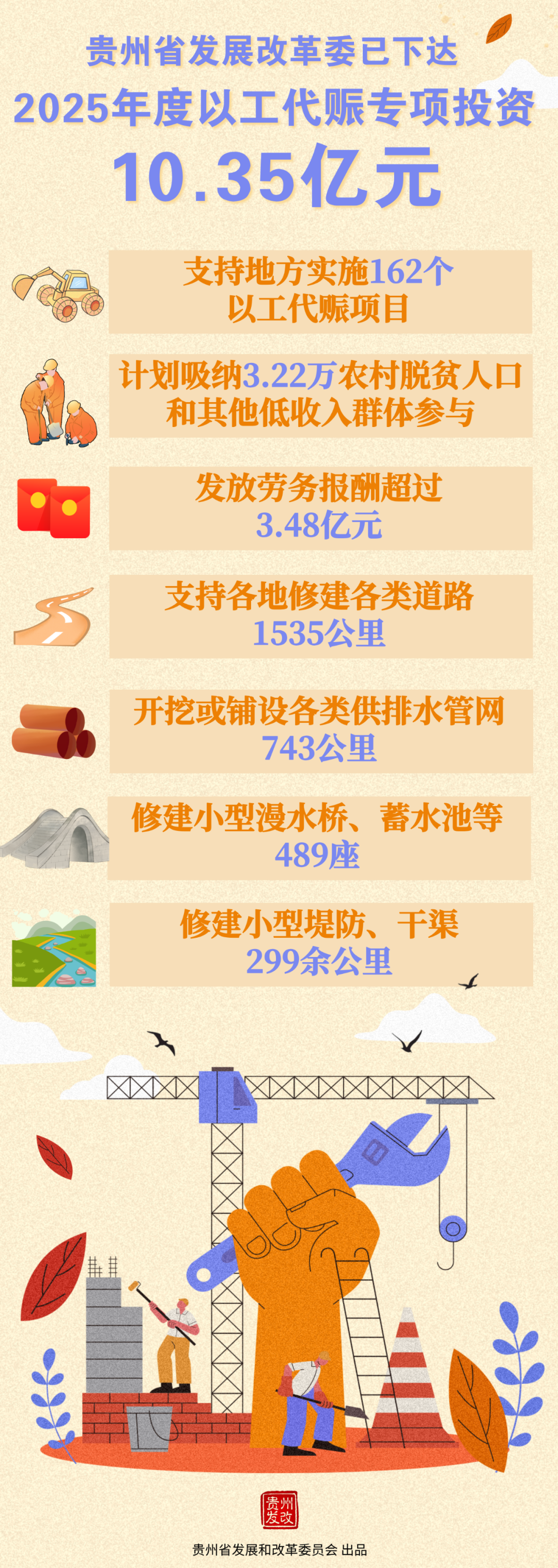 2025年以工代赈专项投资将支持各地修建通村公路、生产便道、产业路等各类道路1535公里,开挖或铺设各类供排水管网743公里,修建小型漫水桥、蓄水池等489座,修建小型堤防、干渠299余公里。