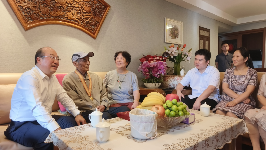 在纪念中国人民抗日战争暨世界反法西斯战争胜利80周年之际,为深入落实党中央关于看望慰问抗战老战士、老同志部署要求,近日,根据省委、省政府统一工作安排,省委常委、省政府常务副省长吴强率队走访慰问抗战老战士、原省计划委员会巡视员毛奇峰,向他颁发佩戴“中国人民抗日战争胜利80周年”纪念章,传递党中央、国务院及中央军委的亲切关怀,并代表省委、省政府致以崇高敬意和诚挚问候。