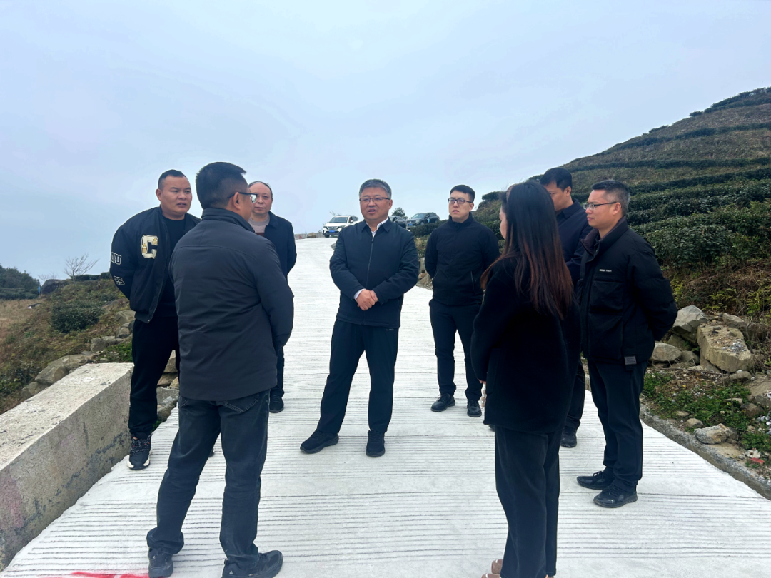 图为邹康在新屯街道坪湘村调研紫茶产业发展情况。