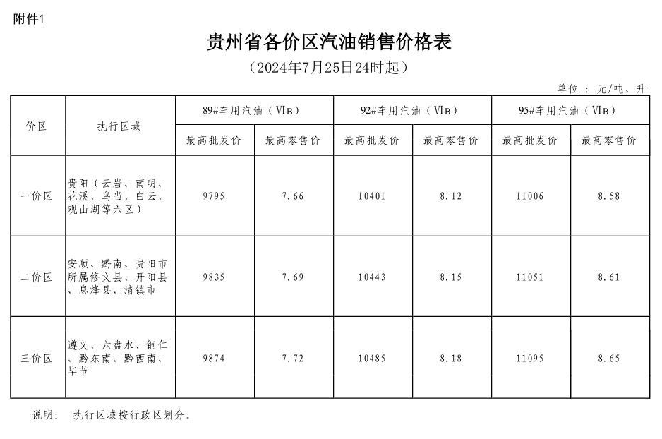 附件:1.贵州省各价区汽油销售价格表