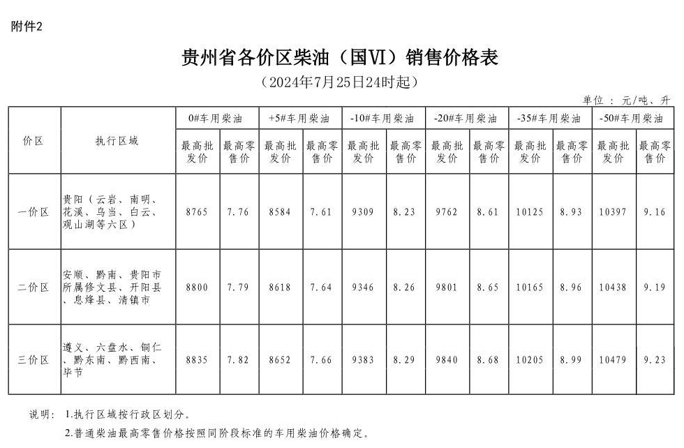 2.贵州省各价区柴油(国VI)销售价格表