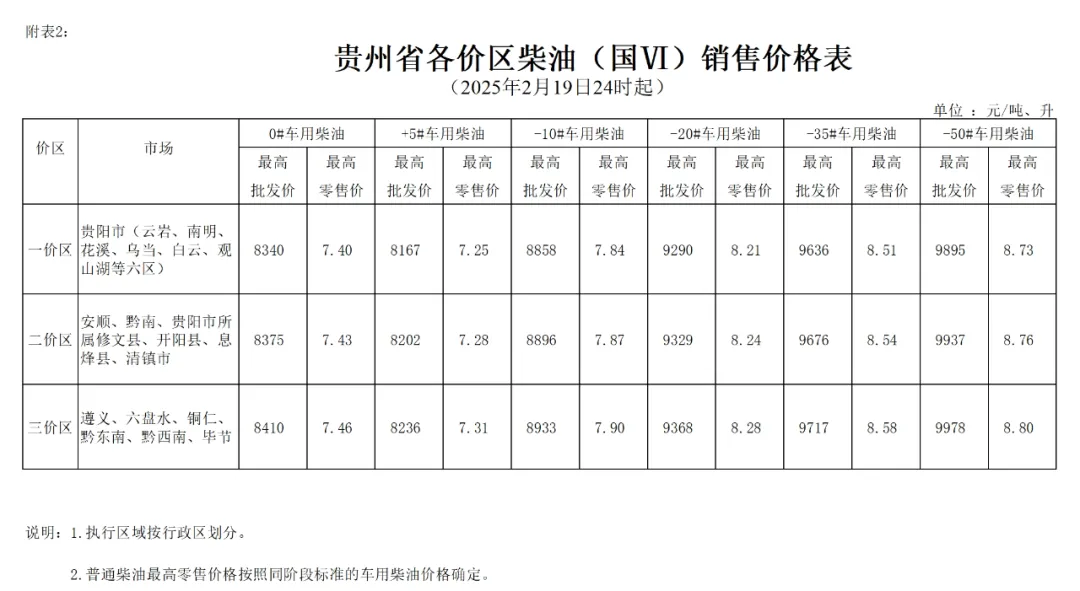 2.贵州省各价区柴油(国VI)销售价格表