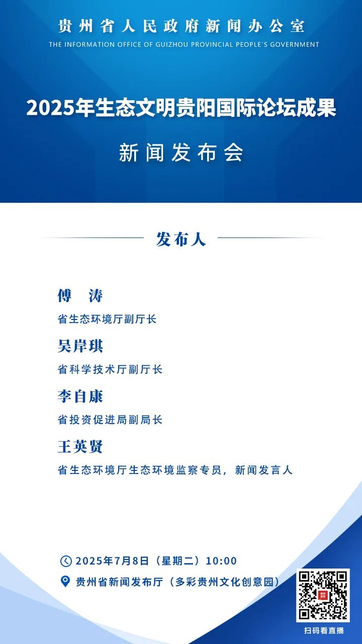 贵州省政府新闻办将于7月8日10:00在贵州省新闻发布厅(多彩贵州文化创意园)举行2025年生态文明贵阳国际论坛成果新闻发布会。