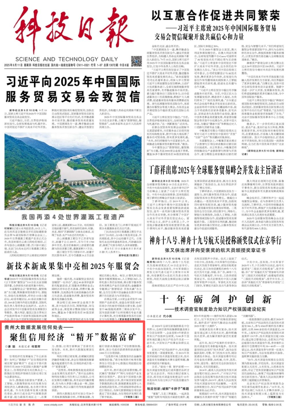 9月11日,《科技日报》头版刊发新闻《贵州大数据发展往何处去——聚焦信用经济 “精开”数据富矿》,关注贵州通过新场景挖掘,将沉睡的“数据矿产”转化为驱动产业发展的信用资产。具体报道如下: