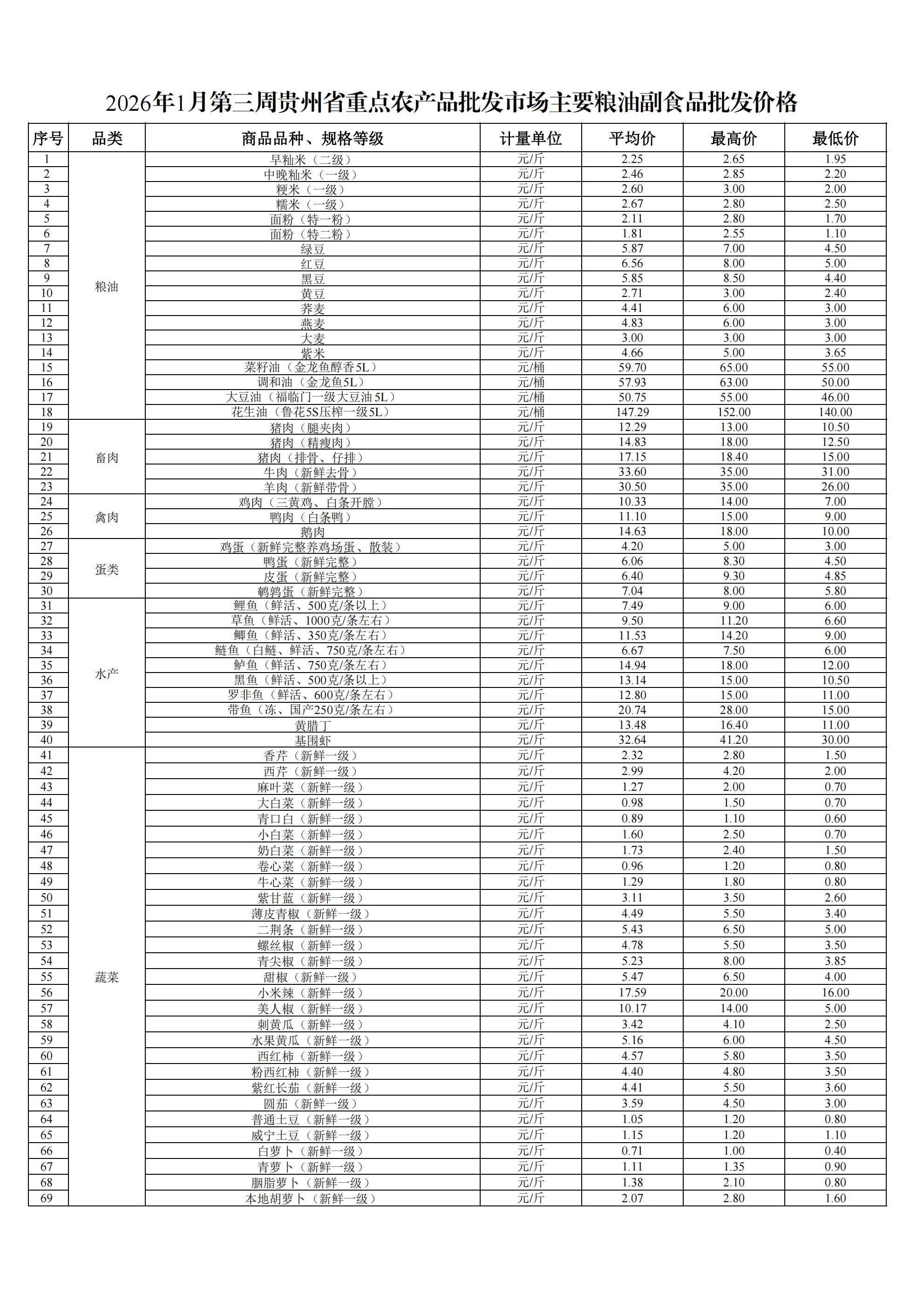 2026年1月第三周贵州省重点农产品批发市场主要粮油副食品批发价格