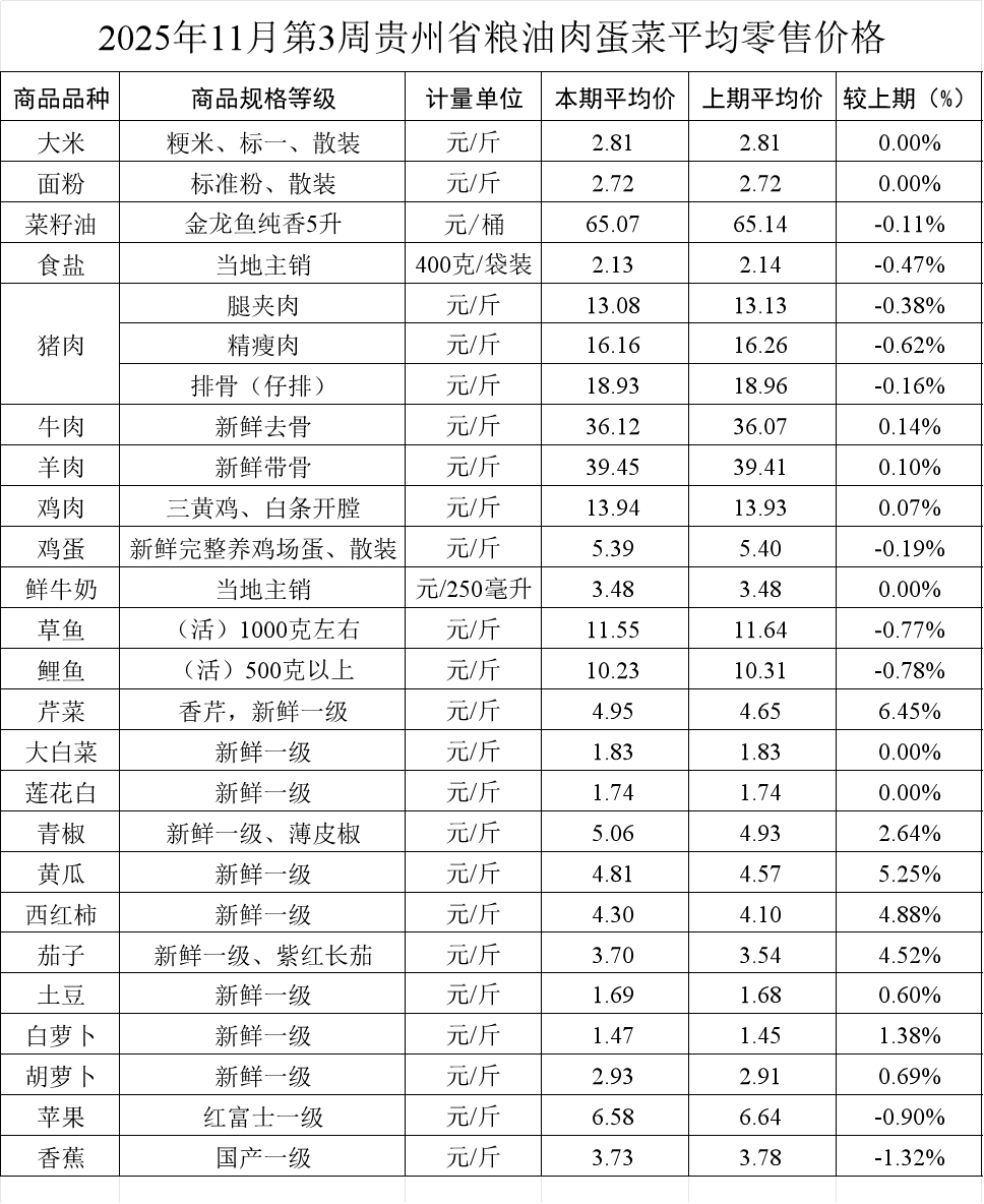 本周,监测的26个品种粮油肉蛋菜鱼奶果零售价格环比11涨10降5平。其中,粮油、牛肉、鸡肉、鸡蛋、牛奶价格基本持平或无变动,猪肉价格小幅下跌。除大白菜、莲花白价格与上期持平,其余蔬菜价格均上涨,其中,黄瓜、西红柿和茄子价格涨幅超过4%。