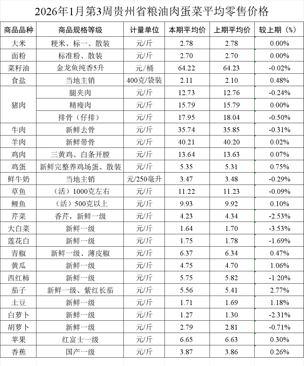 本周,监测的26个品种粮油肉蛋菜鱼奶果零售价格环比11涨12降3平。其中:粮油、畜肉、鱼类、鸡蛋、牛奶价格持平或基本持平,蔬菜价格继续以下跌为主。