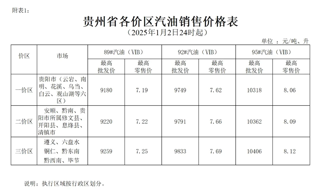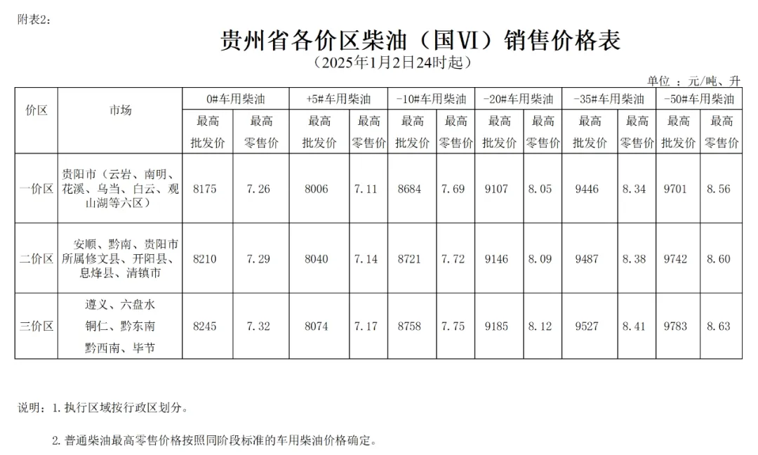 根据成品油价格形成机制,国家发展改革委决定自2025年1月2日24时起上调国内成品油价格。按照国家调整要求和相关规定,我省89#汽油(国VIB)、0#柴油价格每吨在现行标准基础上分别提高70元、70元,具体价格可由各经营企业在不超过最高批发、零售价格的前提下确定。调整后各油品最高价格见附件。相关价格联动及补贴政策按现行规定执行。各成品油经营企业要切实承担起我省成品油市场供应的责任,确保市场供应,督促各分支机构严格执行国家价格政策,规范经营行为。各地相关部门要加大市场监督检查力度,严厉查处不执行国家价格政策的行为,维护正常市场秩序。消费者可通过12315投诉平台举报价格违法行为。附件:1.贵州省各价区汽油销售价格表