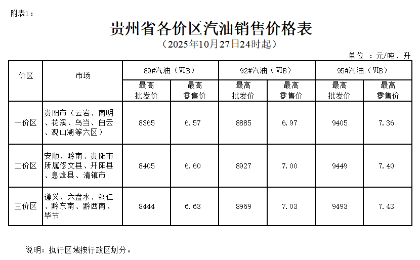 附件:1.贵州省各价区汽油销售价格表