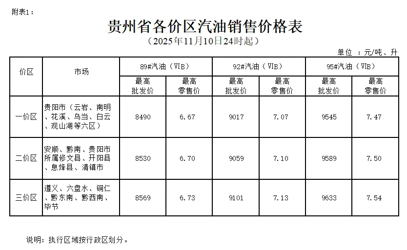 附件:1.贵州省各价区汽油销售价格表