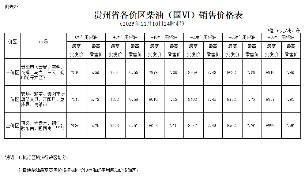 2.贵州省各价区柴油(国VI)销售价格表