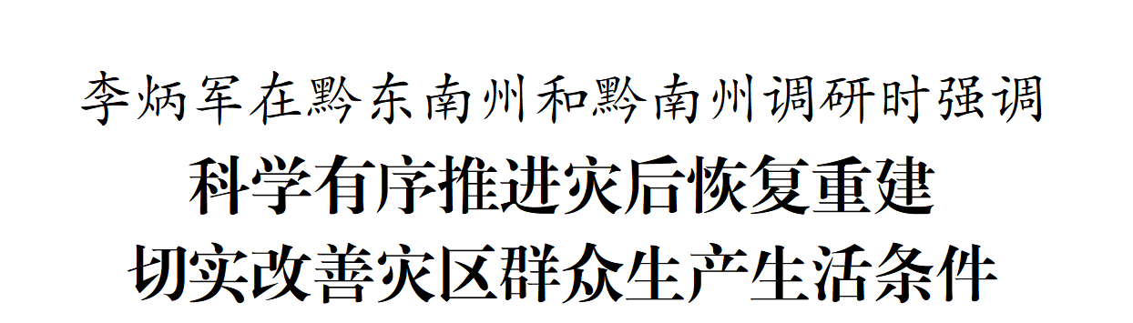 9月15日至16日,省委副书记、省长李炳军到黔东南州雷山县、丹寨县和黔南州三都水族自治县,调研今年6月强降雨受灾地区灾后恢复重建工作。他强调,要深入贯彻落实习近平总书记关于防灾减灾救灾的重要论述和在贵州考察时的重要讲话精神,始终把人民放在心中最高位置,科学有序推进灾后恢复重建,切实改善灾区群众生产生活条件。省领导郭成林、李建参加。
