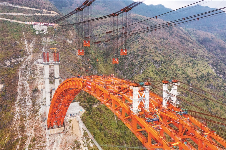 安盘4标项目负责人郑鹏鹏介绍,自2025年6月14日首节段吊装启动以来,项目建设团队先后克服作业空间受限、构件吊装精度要求严苛、极端天气频发等多重挑战。面对主拱圈最大吊装节段近290吨的超级重量,建设团队在采用自主研发的智慧缆吊系统基础上,首创吊装轨迹精准控制技术,为节段吊装装上了“智能导航”,确保节段沿着最优路径平稳、精准抵达预定位置,有效保证了整个吊装过程安全可控。历时6个月攻坚,以88个吊装节段的精准衔接,在云端之上完成了这座超级工程的壮美“描红”。