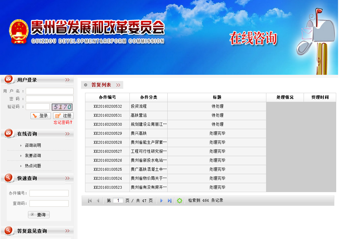 (三)不断推进重大建设项目信息公开。除委门户网站外,通过全省招投标网、贵州新闻网等平台全方位公开,接受监督。全年我委审批项目310个,核准项目11个,备案项目10个。除涉密项目以外,所有审批核准文件均在省发改委门户网站上公布。在接入省政务服务网后,我委审批事项公开工作进一步得到拓展,实现过程结果全公开。一是认真抓好项目各类审批监管平台的建设。根据国家要求和省人民政府办公厅统一部署,我委已牵头组织开展我省投资项目在线审批监管平台和重大项目库的建设工作。其中,我省投资项目在线审批监管平台是在现有贵州省网上办事大厅、贵州省行政审批系统的基础上,按照国家发展改革委有关要求进行改造建设,目前已基本完成了投资项目审批事项清理、制定了相应的办事指南,正在抓紧制定出台平台运转流程和管理办法;同步开发平台软件,平台软件框架设计、基本功能设计完成,互联网网站建设基本完成。已实现了与中央平台的网络对接联通,前置机安装调试完毕,成功上传审批事项信息、项目基本信息、项目办理过程信息等基础数据,上传历史1800余条,以上数据均通过了中央平台的校核。同时,按照国家有关要求和省委省政府部署,我委于2015年11月10日召开了贵州省政府投资三年滚动计划编制暨国家重大项目库建设工作部署培训会,对重大项目库操作进行了实务培训。全省上报的拟纳入省级政府投资三年滚动计划项目共14039个,项目总投资27020.88亿元;拟储备的省级重大项目库项目4227个,项目总投资13080.1亿元。通过搭建这些平台,以信息化手段提高发改系统办公业务效率和政务信息公开透明度、为基层发改部门准确高效履职提供业务技术支持、全面科学归集抽取发改系统的业务数据。二是对项目建设进展及资金管理使用情况、推进重大项目工程建设、公共资源配置、社会公益事业建设等重大领域的决策机制和实施程序及时向全社会进行了公开。其中对政法基础设施国家专项稽察情况、2014年全省中央预算内投资项目执行情况、我省部分水利工程建设项目等专项稽察情况编制了《贵州省重大项目稽察动态》,向有关部门及社会公开;对稽察和检查发现的问题向项目法人及各参建单位下达稽察整改意见、印发稽察报告、通报批评,并抄送当地政府,让涉及群众了解、知晓。三是不断完善贵州省招标投标网的栏目设置和内容更新。作为贵州省招投标领域对外展示的窗口,也是政府指定的本省唯一发布公开招标公告的专业网络媒体。自2003年2月试开通以来,共设领导讲话、招标公告、中标公示、招标变更等十几个栏目。网站的建成为各级政府部门、各类企业、各招标代理机构在发布各类招标公告、开展招标采购、掌握省内招标采购、项目建设信息、了解和传达国家与地方相关产业政策以及培训招标投标专业人才等方面提供全方位、多层次的服务。全年共计发布招标公告28275条,其中工程招标8508条、货物招标2888条、服务招标4016条、中标公示11801条、招标变更1062条。四是不断加强政务服务窗口的服务功能。2014年12月,根据《省人民政府办公厅关于做好进驻省政务服务中心相关准备工作的通知》(黔府办函〔2014〕92号)文件通知要求,经省政府审核后保留的行政审批事项,一律进驻发改委驻省政务服务中心窗口办理,贵州省发展改革委选派1名首席代表、3名工作人员入驻省政务服务中心。目前,我委进驻省政务服务中心共完成行政审批事项共60项,其中行政许可事项17项,非行政许可10项,行政服务事项33项。一年来,窗口共接待前来咨询305件,受理行政审批事项173件(其中办结148件,在办25件),通过不断完善窗口服务,使项目审批流程得到进一步简化,缩短了审批时间,更好地促进了项目审批公开透化。