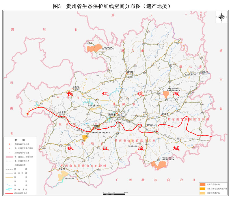 ——遗产地类生态保护红线。主要包括世界自然遗产地、国家自然遗产地、国家自然和文化双遗产地三个部分,全省遗产地类生态保护红线总面积2430.14平方公里,占全省国土总面积的1.38%,其中世界自然遗产地3个,面积1286.75平方公里,占全省国土总面积0.73%;国家自然遗产地4个,面积624.59平方公里,占全省国土总面积0.36%;国家自然与文化双遗产地1个,面积518.80平方公里,占全省国土总面积0.29%。