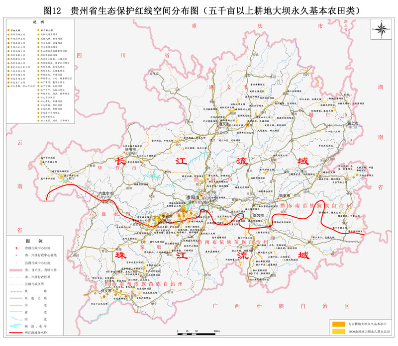 贵州省生态保护红线区由禁止开发区、五千亩以上耕地大坝永久基本农田、重要生态公益林和石漠化敏感区四部分组成。保护范围包括世界自然遗产地、国家自然遗产地、国家自然与文化双遗产地,国家级、省级和市州级自然保护区,世界级、国家级和省级地质公园,国家级和省级风景名胜区,国家重要湿地,国家湿地公园,国家级和省级森林公园,千人以上集中式饮用水源保护区,国家级和省级水产种质资源保护区,五千亩以上耕地大坝永久基本农田,重要生态公益林和石漠化敏感区等12类区域。截至2016年8月底,保护面积(扣除重叠部分)为56236.16平方公里,占全省国土总面积的31.92%。今后新设立的以上12类保护区域自动进入贵州省生态保护红线名录。