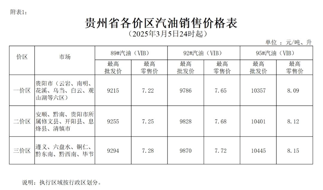 附件:1.贵州省各价区汽油销售价格表