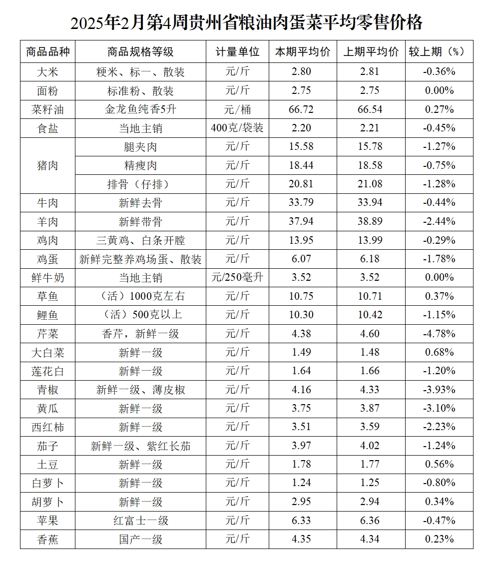与上期(2月19日)相比,本期监测的26个品种粮油肉蛋菜鱼奶果零售价格6涨18降2平,绝大部分品种价格以跌为主。其中,粮油价格基本持平。肉蛋价格均有所下跌。10种监测的主要蔬菜除大白菜、土豆、胡萝卜价格微涨以外,其余品种均为下跌,芹菜价格跌幅超过4%。