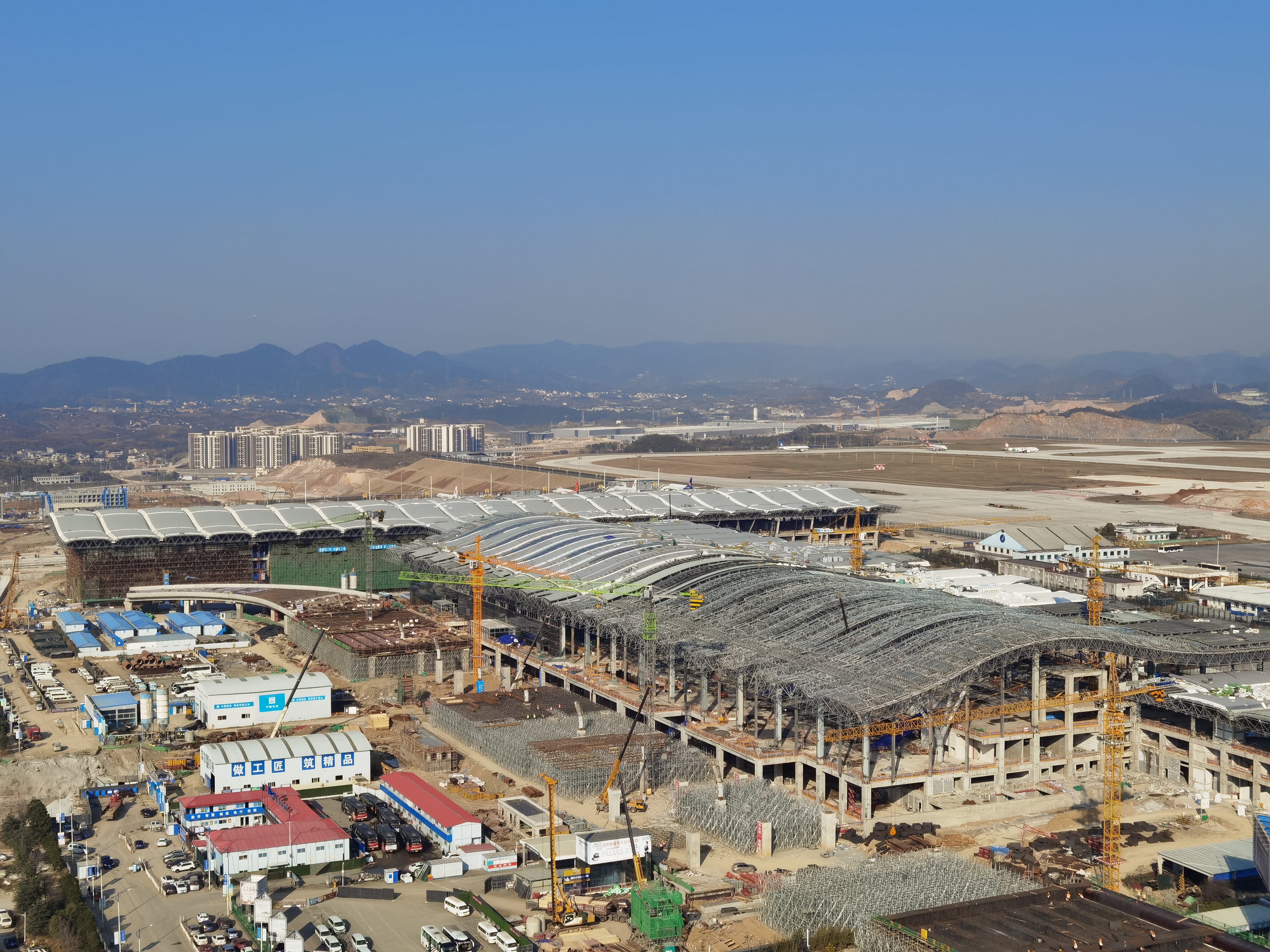 春节前夕,迎着冬日暖阳,记者走进贵阳龙洞堡机场三期扩建工程(以下简称“三期扩建工程”)现场。在位于二号航站楼北侧的T3航站楼施工区,上百来个工人正全力以赴加快建设,主体钢结构已封顶成型,波浪形金属屋面体现建筑展翅腾飞,加之玻璃面墙的设计可谓点睛之笔,使得整个航站楼外形流畅又不失现代感,并与现有航站楼风格协调统一。